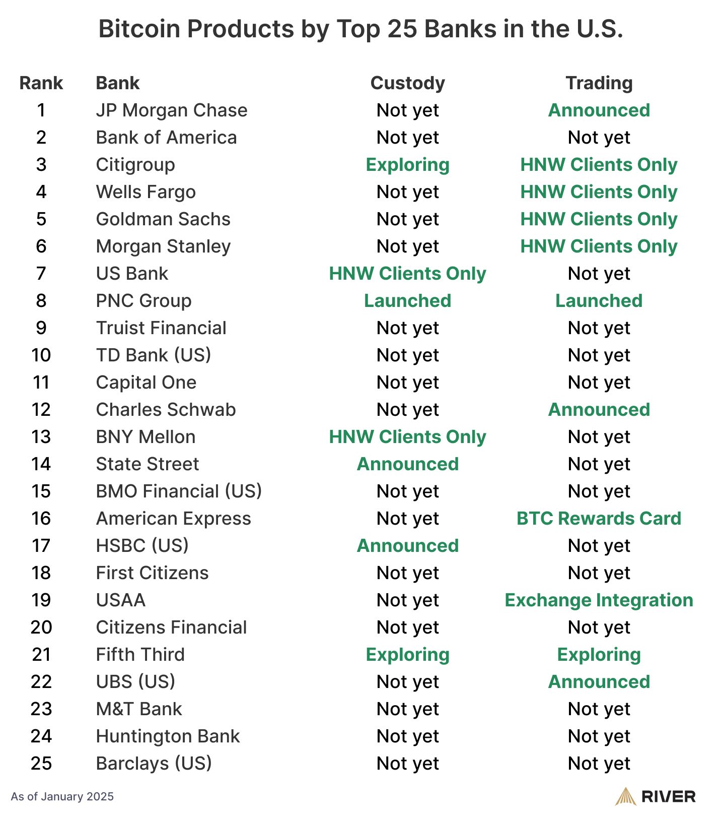 Major banks and financial infrastructures are increasingly building products and services tied to Web3. In the US, 60% of the top 25 banks are reportedly offering or planning Bitcoin-related services, including custody, trading and advisory solutions.
