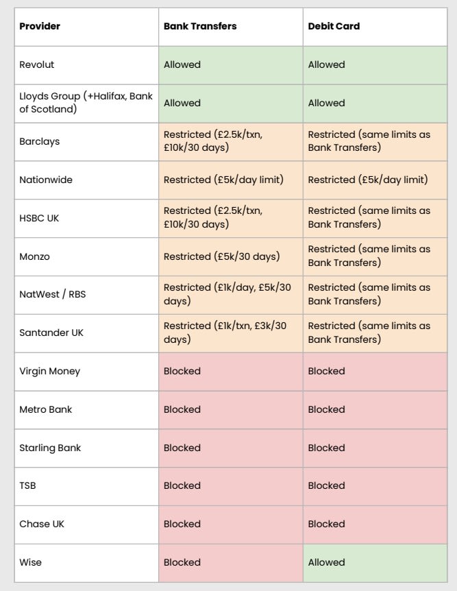 Revolut is one of two banks that permit both bank transfers and debit cards in the UK council’s study, and it is also the platform where Mekras claims to have experienced his recent account freeze. It operates as an authorized UK bank “with restrictions,” meaning it is currently building up its banking processes before full launch. It also holds a European Union banking license through Lithuania and offers crypto trading services in its app.