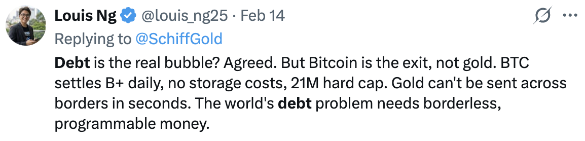 Whether one agrees with his pricing outlook or not, the message is clear: he views gold as structurally undervalued relative to global debt expansion. To Schiff, Bitcoin rallies are speculative waves, while gold rallies reflect deeper monetary realities.