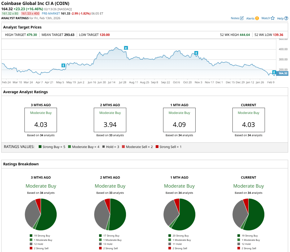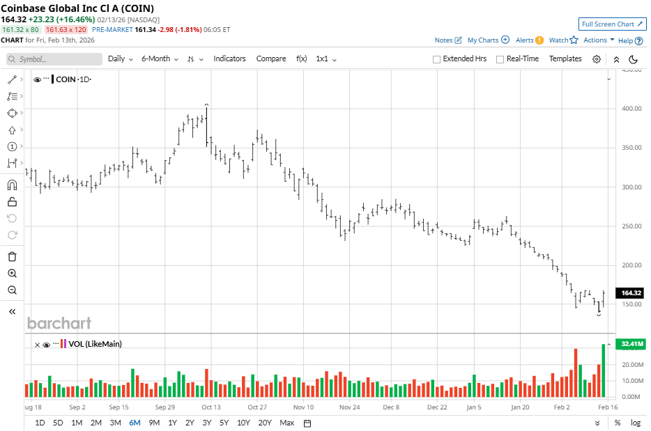 Coinbase stock has been highly volatile in recent days. Its five-day performance is up by less than 1% while COIN stock has crashed 32% in the past one month. Coinbase has also lost 37% over the past three months and 38% in the past 52-week period. Shares are currently 63% below the 52-week high of $444.64 set back in July 2025.