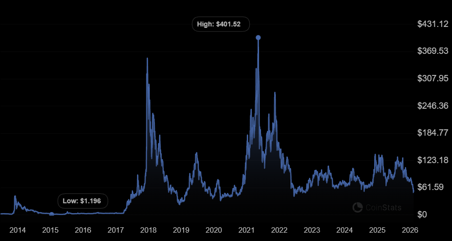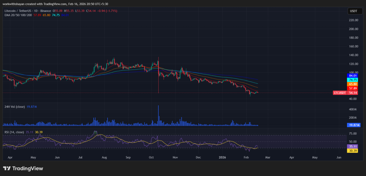 LTC ended 2025 on a bearish note by trading below $80. In January 2026, the price of LTC declined further as it crashed toward $44 in February.