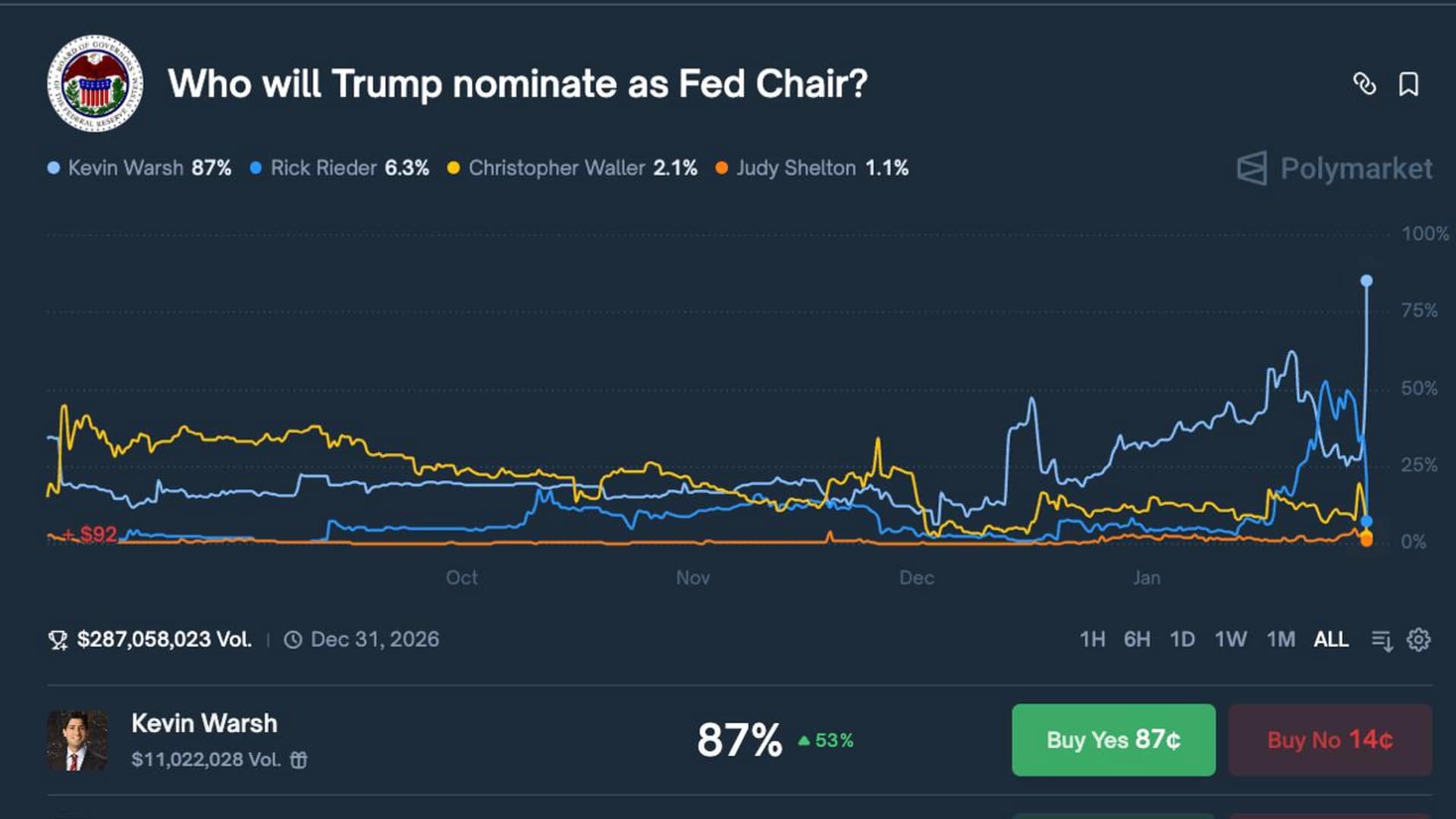 Polymarket Odds Point to Kevin Warsh as Clear Favorite for Fed Chair Under Trump