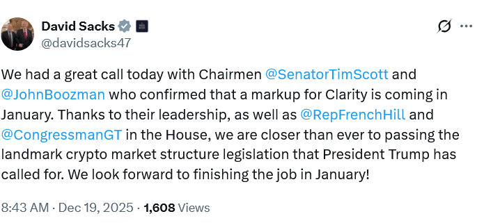 On December 19, the White House’s crypto and AI czar, David Sacks, announced that a markup session would take place in January. However, the planned session was postponed due to substantive disagreements between the crypto industry and the banking sector.