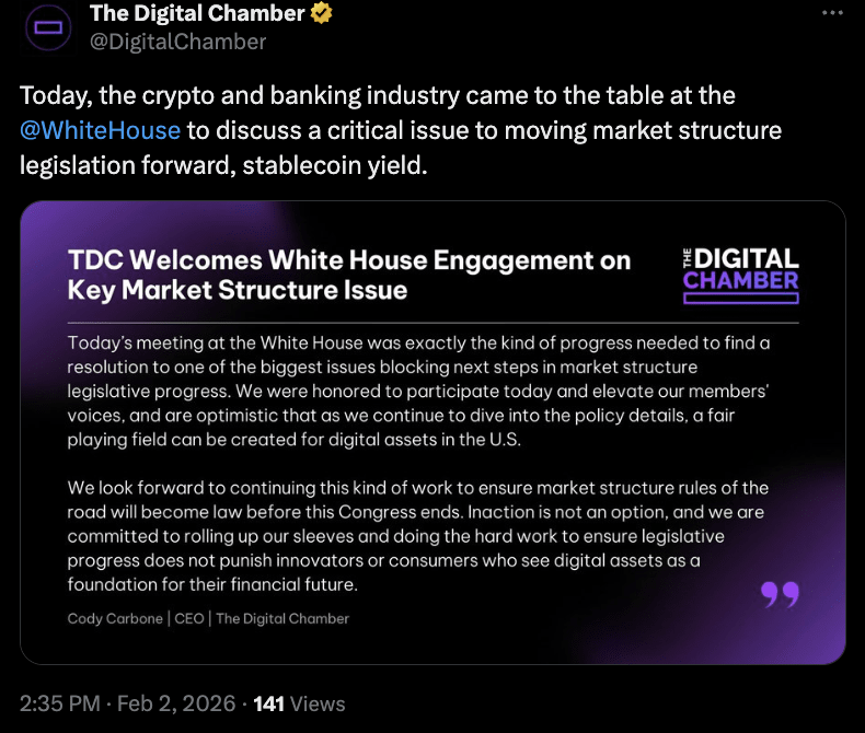 In February 2026, crypto industry executives, lawmakers, and bankers met frequently at the White House and in Congress to resolve their differences. The Digital Chamber of Commerce reported that a meeting on February 3 focused on stablecoin yields.
